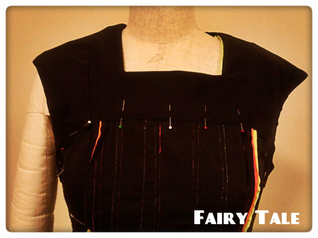 後ろ身頃も同様にまち針をうち、白もをで縫い止めます。