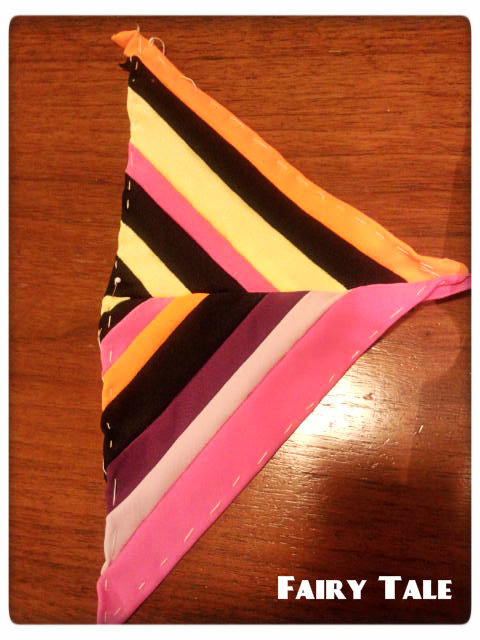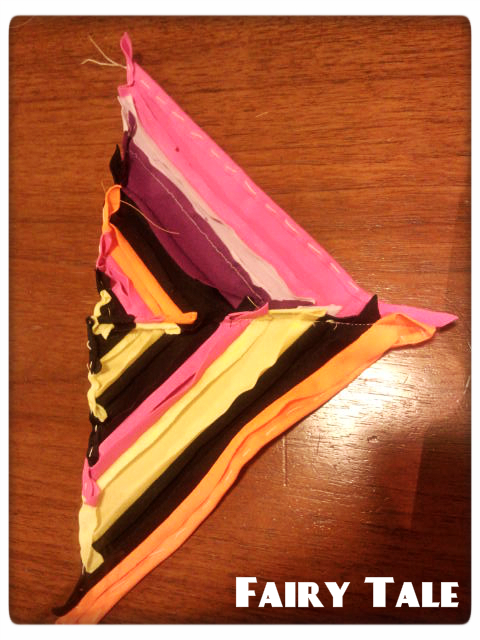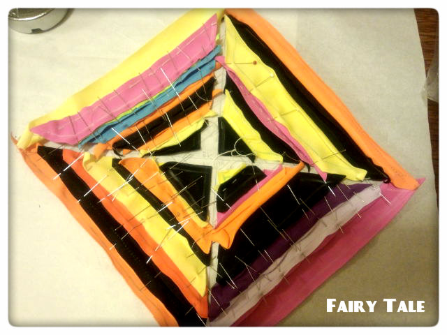 後ろのモチーフ生地を、縫い合わせていきます。作図に書いた色を確認しながら、まち針で止めます。その後いっきにしろもでしつけ縫いをしました。4面とも縫っていきます。4枚三角のパーツが出来上がったら、2枚ずつ縫い合わせていきます。この時生地に合わせてミシン糸を切り替えていきます。2枚を合わせたところ。(上下が逆ですね;)表面に返すとこんな感じ・・・。地味に生地の切り替えが複雑なデザインなのでその点しっかり再現できました。桜都ーsatoーにマシュマロを投げてあげるFacebookXBlueskyHatenaCopy