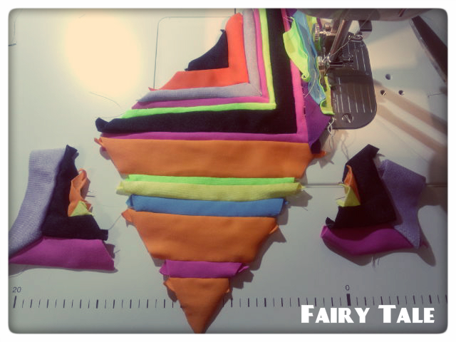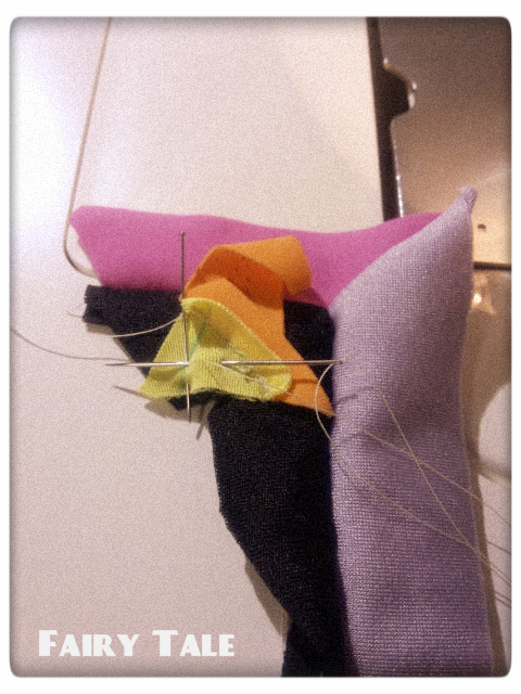 黒とピンク、オレンジ3枚を重ねて縫い合わせます。